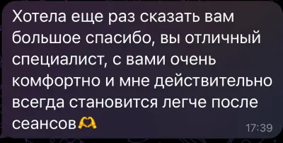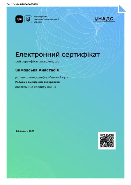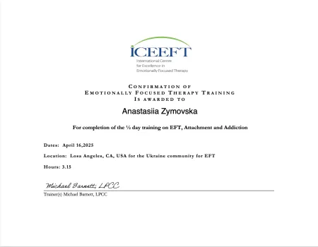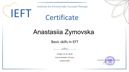 Моя основна спеціалізація — емоційно фокусована психотерапія з урахуванням принципів клієнт-центрованого підходу.