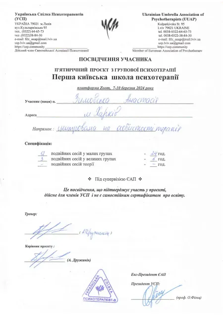 Навчаюся на програмі клієнт-центрованої психотерапії в Українському психотерапевтичному університеті (5-річна програма).